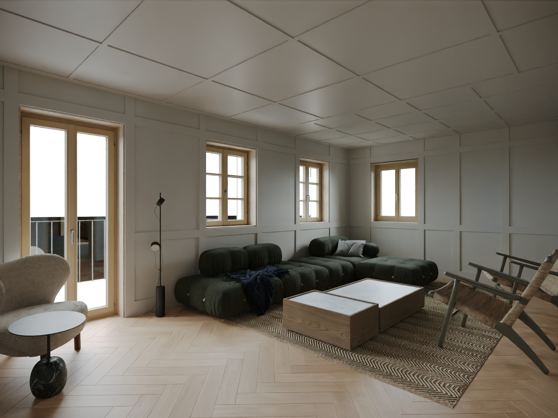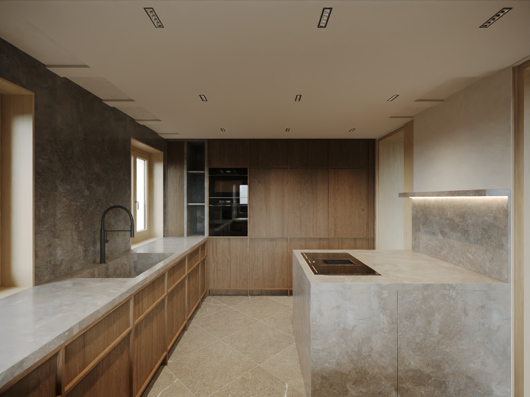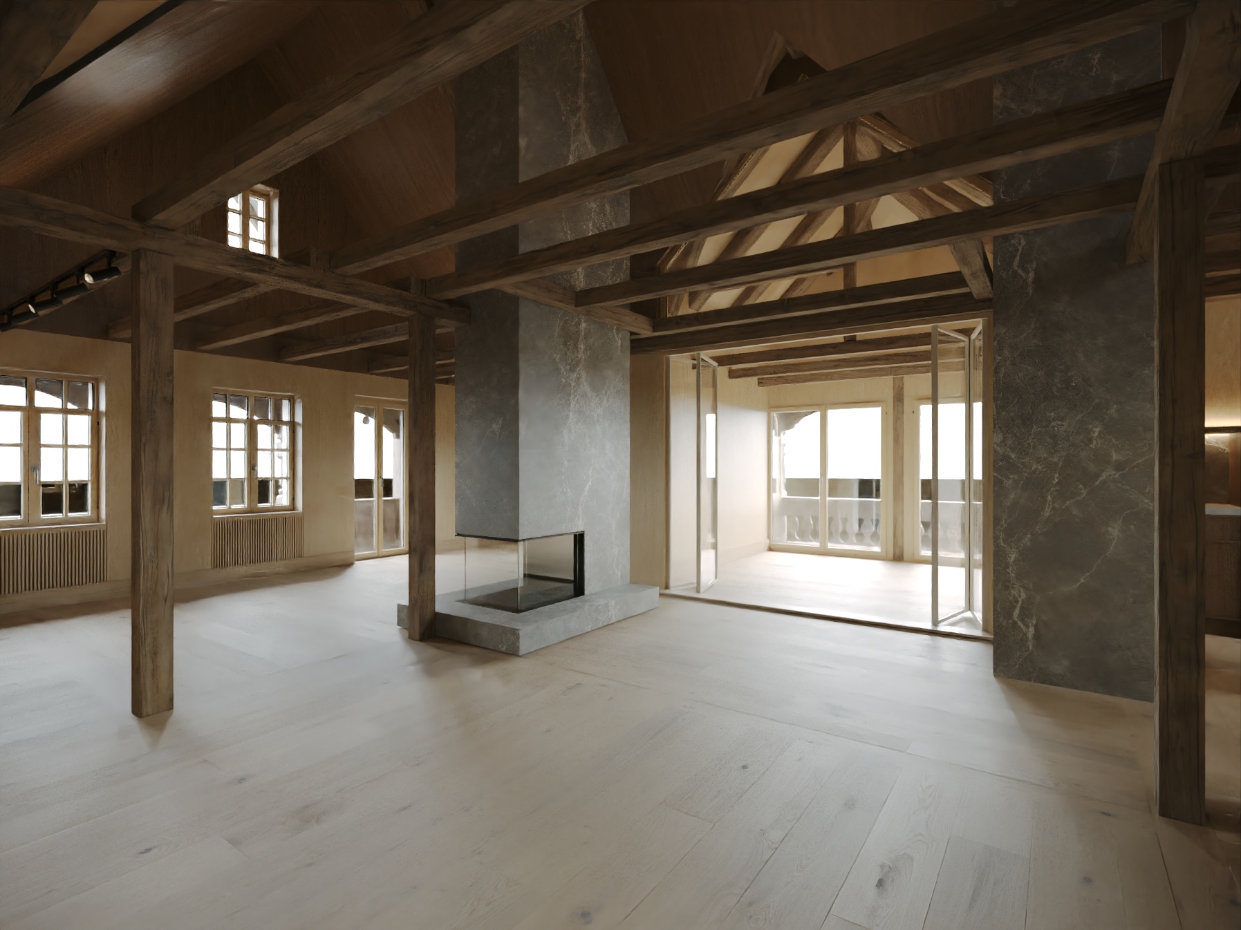 In Kombination mit den grosszügigen Räumen, entfalten erlesene Holz- und Steinmaterialien, wie die 3-Schicht Landhausdielen aus Eiche, Natursteinplatten aus «Quarzit» oder «Travertin» ihre volle Wirkung…